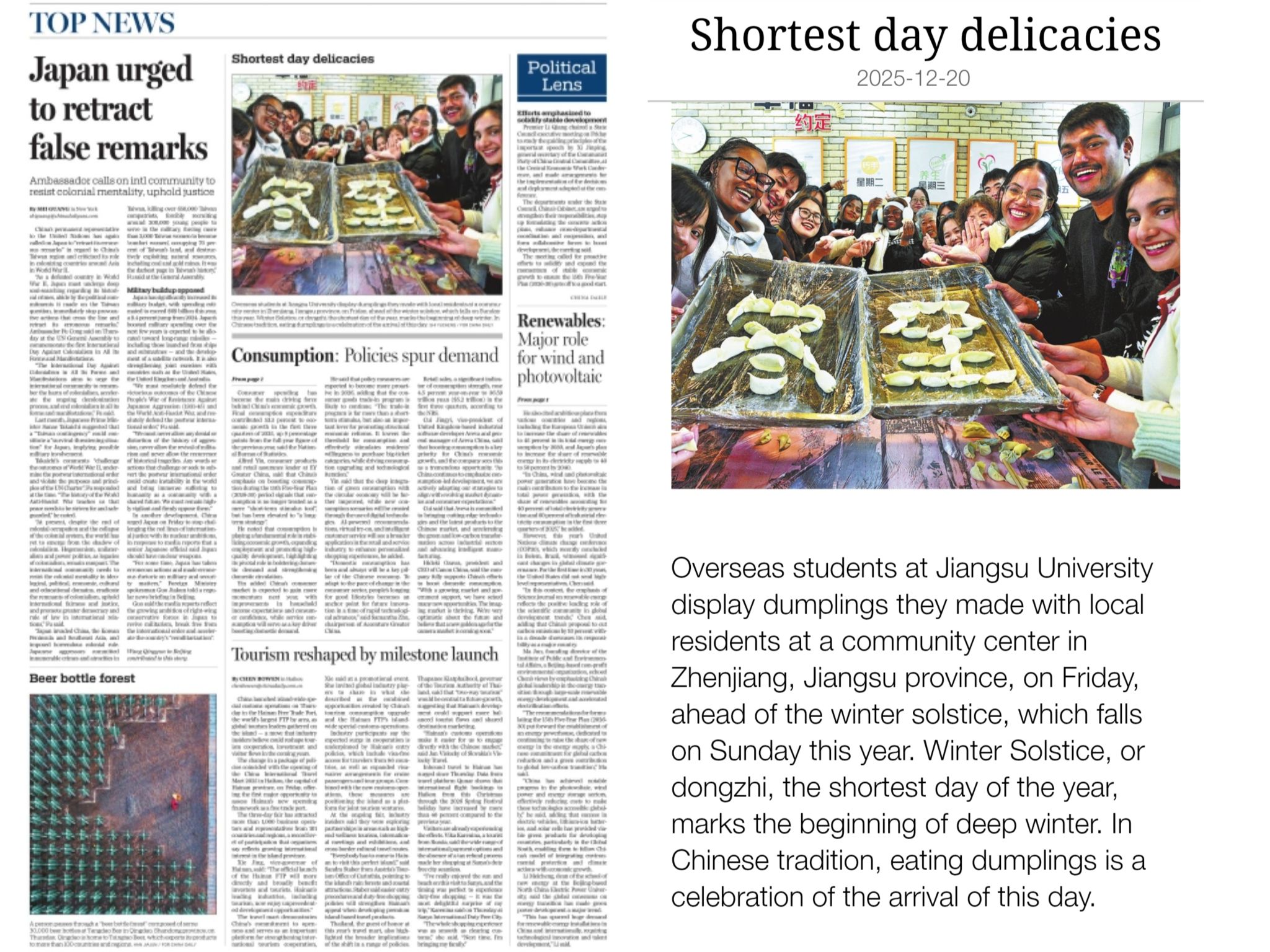 我院组织的留学生体验冬至民俗活动受到China Daily等主流媒体报道