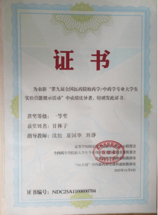 2025年11月7日至10日,第九届全国医药院校药学/中药学专业大学生实验技能展示活动暨实验实践教学研讨会在江苏省南京市中国药科大学举行。本次活动由沈松教授带队,我院学生甘林子和杨丽婷分别荣获一等奖和二等奖,取得了优异成绩。