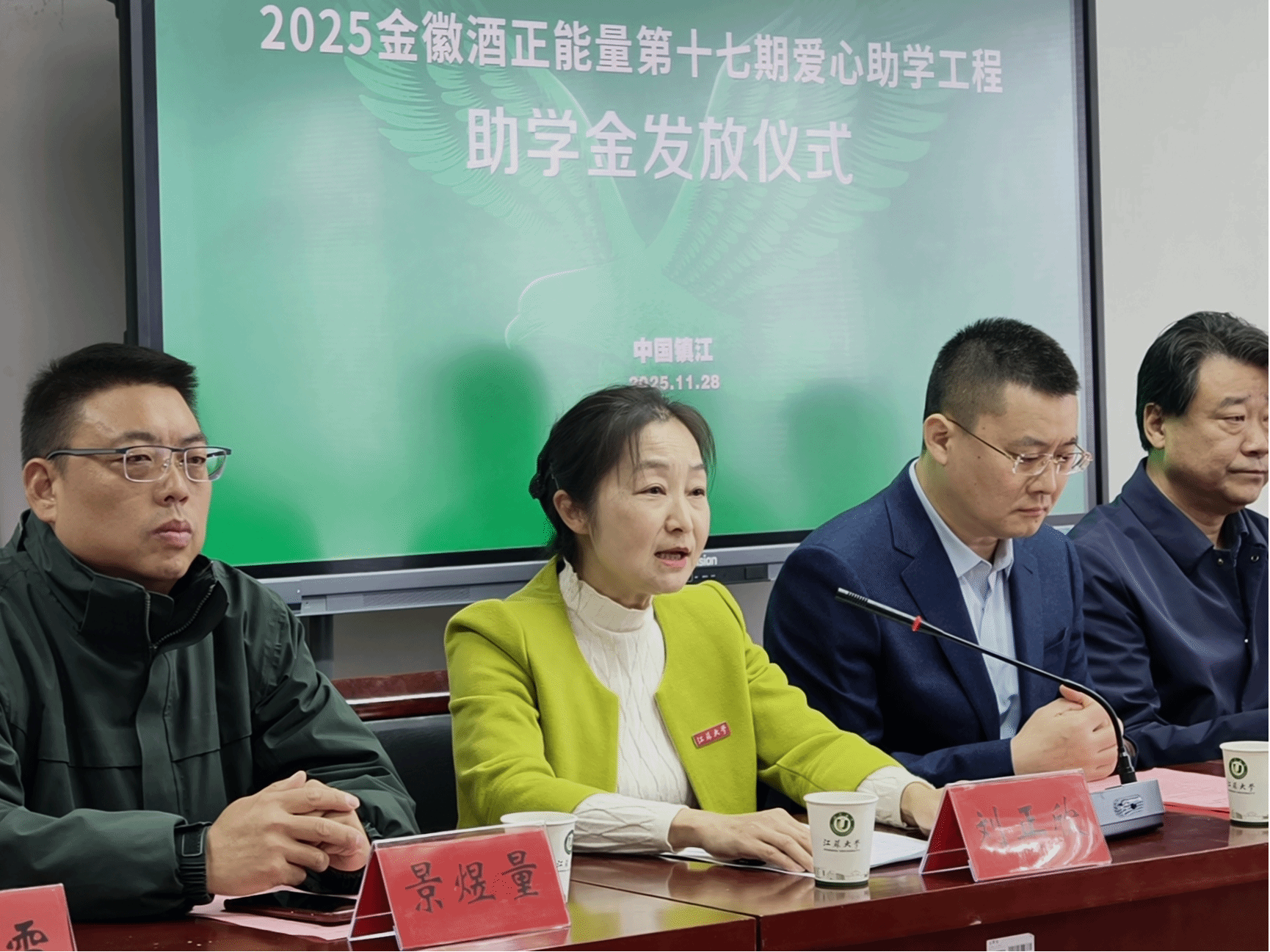 为进一步做好资助育人工作,提升资助工作的内涵和实效,使资助政策得到有效落实,11月28日,金徽酒正能量基金助学金发放仪式在三江楼1818报告厅顺利举行。我院党委书记刘正欣、党委副书记副院长伍新雷,教师教育学院党委书记卜广庆、金徽酒股份有限公司总裁助理王磊、常镇大区经理孙可、煜源商贸经销商景煜量以及近30位受助学生出席仪式。