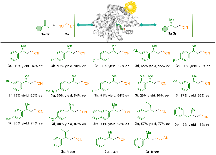 酶促直接引入氰基的策略仍不成熟,限制了药物和功能材料中手性腈衍生物的合成。本文发展了一种光酶促γ-氢氰化策略,实现了对这一瓶颈的突破。通过工程化烯还原酶,在可见光激发下,还原型黄素辅因子可高效活化具有挑战性的脂肪族C─Br键(如溴乙腈),生成的氰甲基自由基在酶活性位点内被精确限制并定向,与α-甲基苯乙烯偶联。该体系展现出显著的立体控制能力,活性位点同时负责自由基生成与后续对映选择性的氢原子转移,可生成多种γ-立体中心手性腈,产率最高达93%,对映选择性可达94% ee,而此类反应对传统过渡金属催化具有相当挑战性。该研究不仅提供了一个稳健的非对称氰烷基化平台,也推动了光酶促催化的发展,首次证明非活化烷基溴化物可作为可控成键的有效自由基前体。