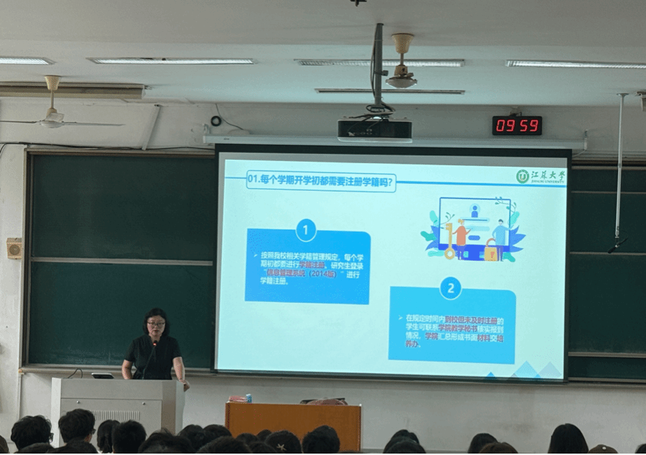 讲座中,童珊珊副院长介绍了新生入学教育与上课时间、培养计划提交节点;讲解培养环节选课、课程考核、学术活动等要点及流程;说明学位工作中论文认定、科研积分认定规则;还解读了科研训练积分规定、各类专业学位研究生培养方案等内容。